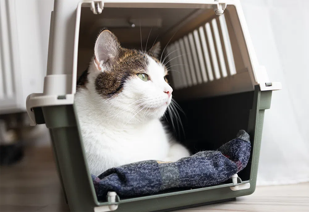 • Elige una transportadora tipo soft, que quepa debajo del asiento, y colócala sobre una manta que huela a casa.